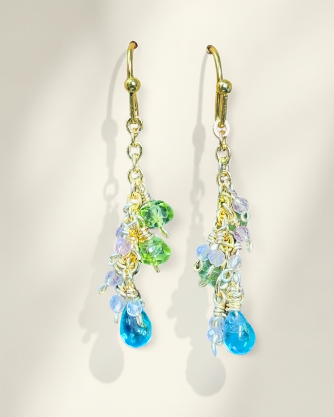 Instead of relying on a single stone, these earrings layer three energies the calm of apatite, the renewal of peridot, and the gentle joy of tourmaline into one balanced design.
